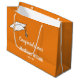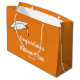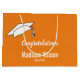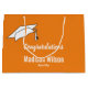 A grad cap is above the customisable graduate's name in white text on an orange background. White text says 'Congratulations'. You can customise class of year.