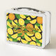 Orange slices and leaves. Seamless pattern. Custom background colour. Custom text on each side.