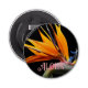 Round, magnetic bottle opener that features the photo image of an orange bloom of the tropical Bird of Paradise Plant printed on a black background along with the word ALOHA printed in light pink, stylised lettering. Also referred to a a Crane Flower. A lovely, floral design!