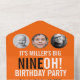 Bold simple graphic bright orange, black and white photo template all-in-one 90th birthday invitations. Personalise this detachable milestone ninetieth birthday invitation with your own birthday party event details, and up to three different photos of your birthday boy. Invite comes with a simple RSVP detachable reply card where you can also request a song to dance to or ask for any dietary or special requirements if required. Simple three photo circles for your now and then photos and space for photo in the 0 of 90 on the outside flap that is up to 4 different photos for you to add in. Other colours and matching items are available. © Original design by Sarah Trett for www.mylittleeden.com on Zazzle.