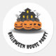 Use this classic round sticker to go along with the spooky invitation to your Halloween house party. It has an image of a haunted house with carved pumpkins in front of it with the phrase 'Halloween House Party' in creepy black typography.