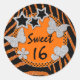 This chic and trendy customisable 1.5" round Sweet 16 birthday sticker has an orange faux glitter (PRINTED) and black zebra print animal stripes with a polka dots pattern and silver faux glitter (PRINTED) butterflies, stars, hearts, and a funky flower, with text boxes to customise how you want on it that will appeal to a modern, young girl. You can select from 2 sizes. Everything will print as you see it on your monitor, so if you need help customising your text, or if you would like a matching sweet sixteen, Bat Mitzvaj, or Quinceanera party invitation, or if you want it in another colour combination, please email niteowlstudio@gmail.com BEFORE you order.