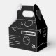 Complement your space birthday party with cute favour boxes for the little ones. The boxes are black with some spaceship elements that appear in controls. At the front, there is an illustration of a spacecraft screen with the information you can personalise. Illustrated and designe by Patricia Alvarez.