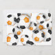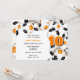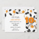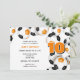 This soccer themed party invitation features clusters of orange, black and white soccer balls at the right and top edges on the front and a single cluster covering the back of the invitation - customise the party details on a white background - by katz_d_zynes