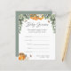 Let baby shower guests take their best guesses at baby's birthdate and time, weight and length! Place a stack at the entrance to the event, pass them around, or leave one at each place setting. Makes a fun keepsake for the mama-to-be, too, when compiled in a pretty box or binder. Designed to match our Orange Blossom Honey baby shower collection, this summery nature inspired design features green watercolor foliage, a jar of honey, and tiny honeybee illustrations. Personalise with the mother to be's name and baby shower date along the bottom.