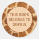 Book name plate sticker with an orange and brown giraffe print. Text says, "This book belongs to YOUR NAME." Font, font size and colour are completely customisable, so make it your own.