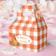 A set of favour boxes with a classic orange and white buffalo check design and two pumpkins . Ideal for any fall event you might be organising such as baby showers , birthdays , a group event , a Halloween party , a Thanksgiving gathering , a retirement celebration and so much more . Replace the text with your own .