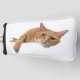 Portrait of an orange tabby cat domestic shorthair laying down on a white background with paw draped over a table