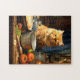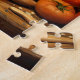 This is a puzzle of a cat. Its imagery depicts an orange cat sitting on a kitchen table with food. This puzzle makes a great gift idea for individuals who love animals, cats, orange tabby cats, and food-themed images. This puzzle's content is appropriate for individuals ages 6+. It is available in all sizes and may be adjusted by the customer.