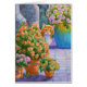 An orange cat peeking out from behind potted flowers on a patio. Visit Cat-Paintings.com for more ginger cat watercolors.