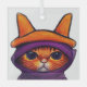 Orange Cat with Purple Witch Hat Halloween Glass Ornament. A drawing of a cute orange cat with a purple and orange hat.