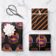 Orange Cat with Purple Witch Hat Happy Halloween Wrapping Paper Sheets. A drawing of a cute orange cat with a purple and orange hat. Happy Halloween orange text on a black background.