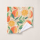 Patterned towel set with a retro vibe. A pattern composed of sliced oranges, whole oranges, green leaves and white blossoms.
