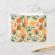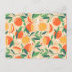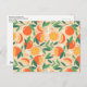 Postcard with a retro vibe. A pattern composed of sliced oranges, whole oranges, green leaves and white blossoms.