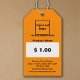 Orange colour price tag with a generic design and template for various products. Customise it by uploading your business logo, typing your business name, address, phone number, e-mail, website and the name and price of your product. You can leave the price placeholder blank if you plan to write the price later. Please check the appearance of the front and back sides after uploading logo and typing texts. If the appearance is pleasing to you, you can place your order now. If you need to resize and reposition the logo and texts to fit on this tag, please adjust in the design tool. You can also change the font style, font colour and background colour in the design tool.