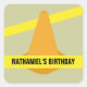 A birthday sticker featuring an illustration of an orange construction cone and yellow tape. Customise the black text. Look for matching birthday party invitations at Jill's Paperie.
