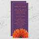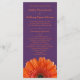 You can personalise all the text on these orange gerbera daisy (gerber daisy) flower, purple background personalised affordable wedding programs. The design features a bright and cheerful orange daisy on a purple background background. Simple and elegant floral design. NOTE: This is a flat printed design without any raised or 3D embellishments. To change the text, use the personalise options. Or, for more extensive changes (font, font size, font colour, text placement), choose customise it. You can even change the purple background colour is you want. This is a great inexpensive wedding program for a wedding in the spring, summer or fall / autumn or a wedding with an orange gerbera daisy flower theme.