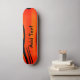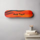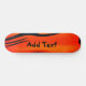 This skateboard has an orange design on it and you can add your own text to it.