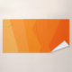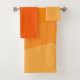 This towel set has light orange washcloth, dark orange hand towel, and a bath towel with a geometric design of four shades of orange running horizontally.