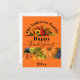 Send a vibrant splash of fall with this customisable Thanksgiving postcard, anchored by a brilliant orange background. The design is split into two bountiful harvest bands. The upper arch features a colourful arrangement of a bright sunflower, deep red cobs, and multicolored maple foliage. Below the elegant "Happy Thanksgiving" script, the lower border showcases a classic orange pumpkin resting amongst purple grapes, crisp green apples, and dark plums, all surrounded by scattering autumn leaves and berries. Easily personalise your family name and the year to deliver a warm, seasonal greeting.