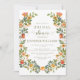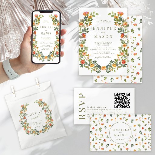 Elegantly refined, this rustic bridal shower invitation showcases a delicate wreath of orange flower blooms painted in soft watercolors. The invitation is adorned with modern calligraphy text in a sophisticated dusty green hue, creating a timeless and graceful design. Perfect for setting the tone for a memorable celebration.