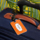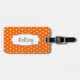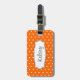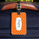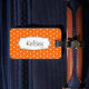 Orange luggage tag great brightly coloured named id tag to help you find your case. Personalise with your first name on the front and full address on the reverse. Pretty design with a simple flower orange and white polka dot pattern uniquely designed by designer Sarah Trett.