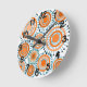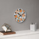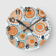 This wall clock has a design of rings and circles in shades of orange with teal lines crossing behind them forming flowers on a field of white.