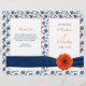 Orange gerbera daisy (gerber daisy), navy blue and white floral damask and ribbon personalised wedding program. The text is all fully customisable. The program itself is intended to be folded down the middle when you receive it. You can change the text using the personalise option. For more extensive changes to the program, including changing the font, font colour, font size, or text placement, choose the "customise it" option. This is a great wedding program for a summer or fall / autumn wedding with a gerbera daisy theme. The colours are bright orange, navy or marine blue, and white. Elegant and cheerful. This program is currently customised for a wedding, but would also work great for an anniversary party program (renewal of vows perhaps) or a church bulletin. All you need to do is change the wording. NOTE: This invitation is a flat printed design without any 3D embellishments.
