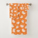 This design features a playful Halloween-themed pattern with a vibrant orange background. The design showcases an array of cute, cartoonish ghosts in soft, off-white tones. Each ghost has a unique and endearing expression, ranging from cheerful and smiling to slightly surprised or sleepy. Scattered between the ghosts are small, whimsical star shapes in a pale yellow, adding a touch of magic and fun to the overall design. The pattern exudes a lighthearted and festive spirit, perfect for the Halloween season.