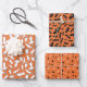 A set of wrapping paper sheets for Halloween featuring three black, orange and white patterns: ghosts; bats; and stars.