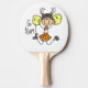 Double sided ping pong paddle with our cute female stick figure cheerleader design with cheerleader in an orange uniform with yellow pom poms and text that reads Go Team!