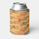 This can cooler has a mid-century modern design of repeating rectangles in orange, gold, and brown with circles layered on top.