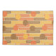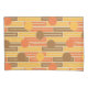 This pillowcase has a mid-century modern design of repeating rectangles in orange, gold, and brown with circles layered on top.