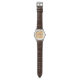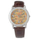 This men's watch has a mid-century modern design of repeating rectangles in orange, gold, and brown with circles layered on top.