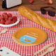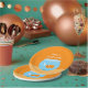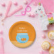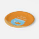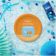 Whimsical and cute kids birthday party paper plates with an orange and blue goldfish design that has a yellow fish in a fish bowl, personalised with any name.