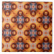 Based on abstract art this special design incorporates a variety of orange, brown, blue and cream geometrical forms (squares, circles) in a mosaic formation.