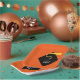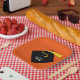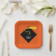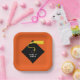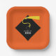 Creative graduation party or event plates for class of '25 grads featuring funny line and classic black graduation cap with gold tassel on orange background.