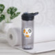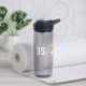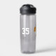 This team colours soccer themed water bottle is suitable for boys or girls and features the realistic image of a soccer ball that has orange, grey and white panels, upon which you can personalise the athlete's monogram or varsity letter - customise the school or club name encircling the top of the soccer ball, athlete name below, and jersey number on the sides of the bottle - by katz_d_zynes