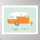 This art print features an original illustration by Charming Ink of a retro orange camper, also known as a caravan. The script font proclaims — happy camper.
