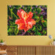 This Canvas Print brings us the beauty of an orange hibiscus flower waking up to the morning sunlight. The original photograph by ZoeSPEAK focuses on the flower petals with all their curves, the way they layer over each other. Enjoy the soft orange colour of the bloom against the spring green colours of the leaves in the garden.