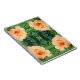 The original pattern on this Notebook was made from an original photograph by HomeWare. The orange hibiscus flower we see in the photo is peeking out from among some green fern fronds in a lovely garden. The flower is in full bloom, with its ruffled edges standing out from the background of ferns. The shape of the flower is like a trumpet, curving outward, with red dots on top of yellow stems in the centre of the bloom. The photo is a closeup showing the detail in the flower petals of this peach coloured beauty.