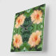 The artwork on this Square Wall Clock was made from an original photograph by HomeWare. The orange hibiscus flower we see in the photo is peeking out from among some green fern fronds in a lovely garden. The flower is in full bloom, with its ruffled edges standing out from the background of ferns. The shape of the flower is like a trumpet, curving outward, with red dots on top of yellow stems in the centre of the bloom. The photo is a closeup showing the detail in the flower petals of this peach coloured beauty. On the clock there are white numbers which you can remove if you prefer.