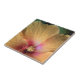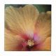 The original photograph by MaeFlowers on this small Ceramic Tile is a closeup of an orange hibiscus flower. The flower petals are a yellow orange colour, turning pink into deep red at the flower's centre. We can see the details of nature's pollen system, soft red dots and tiny yellow florets. The veins in the petals can be seen spreading outward their ruffled edges. A bit of leafy green background sets off the ruffles.