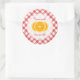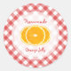 Customisable retro stickers for homemade orange jam, mandarin jelly or preserves jars with fresh ornage slices on red and white gingham tablecloth pattern. The stickers can personalise the lid or the jar itself. Other fruits jam stickers and labels also available!