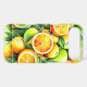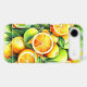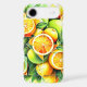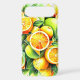 Geometric fresh oranges and lemons surrounded by lush green leaves.