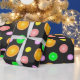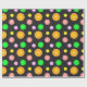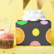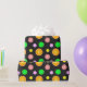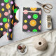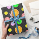 Unique fun birthday party gift wrapping paper. Orange, lemon, lime and grapefruit summer party pattern. Different sizes of citrus fruit with bold yellow, orange, purple pink and green colours on dark grey.