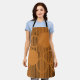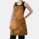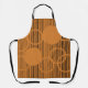 This apron has a mid-century modern design of black vertical lines with circles scattered on top on a field of orange.