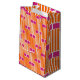 This gift bag has a mid-century modern design of orange vertical lines with pink rectangles above, repeated over the design.
