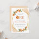 This citrus themed first birthday invitation features a gold geometric frame adorned with watercolor oranges. The word "ONE" appears in orange capital letters with a watercolor orange in place of the "O." Add your little cutie's name and birthday in modern orange handwriting script and the party details in black sans serif. The back of the card is a pastel shade of orange matching the watercolor highlights on the front. An ideal gender-neutral theme for a summer first birthday party!