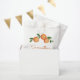 Three watercolor oranges on a leafy branch appear above the name of the mum-to-be in modern orange handwriting script on these sweet citrus-themed baby shower favour bags. Add the words "baby shower" and the date below in green sans serif font.